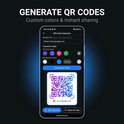 In addition to scanning, the app also allows users to create their own QR codes for various purposes such as links, WiFi passwords, contact cards, and plain text. Users can customize the colors of the codes and save them to their gallery or share them instantly.