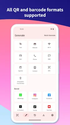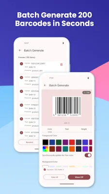 For advanced code generation, the app offers a variety of features, including the ability to create customized codes with professional templates, solid colors or gradients, and eye patterns. Users can also add custom logos with auto error correction and export codes as PNG, JPEG, or WEBP. The app also allows for batch generation of up to 200 barcodes at once through CSV import or manual input.
