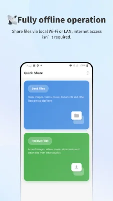Quick Share is a user-friendly application that allows for easy and secure file sharing between devices without the need for an internet connection. It operates fully offline, utilizing local Wi-Fi or LAN networks to transfer files. This means that you can quickly and easily share documents, photos, videos, and other files with colleagues, family, or between your own devices in a variety of settings, such as home networks, office environments, or any local setup.