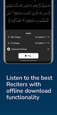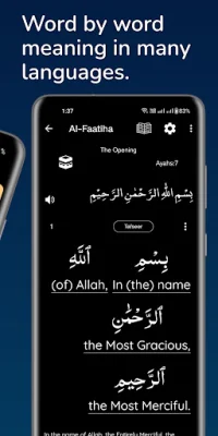 Other features of the app include bookmarks and favorites for ayahs and words, the ability to mark verses as last read, and an option to import and export bookmarks and settings to share across devices. You can also listen to the full Quran in audio format, with multiple recitations available, and the option to enable English and Urdu translations.
