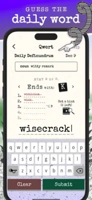 Qwert offers six unique and challenging game modes to keep your thumbs nimble and your brain sharp. In Time Attack, you'll need to think fast and come up with as many words as you can. In Wordplay, the highest scoring word wins. And if you need a break from the competition, you can try out Splat, a solo survival mini-game where you'll need to squash a pesky infestation of flying letters. Plus, with the newest game mode, Daily Definundrum, you can test your word knowledge every day by guessing a new word based on its definition and a few hints - it's like Wordle for word nerds!