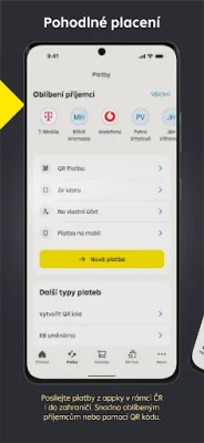 S naší aplikací budete mít jednoduché domácí platby. Nemusíte se trápit složitými formuláři, stačí vybrat příjemce ze seznamu nejčastějších nebo použít QR kód pro rychlejší vyplnění parametrů platby. Navíc můžete snadno provést platbu mezi svými účty tím, že na hlavní stránce podržíte prst na jednom z účtů a přetáhnete jej na jiný.