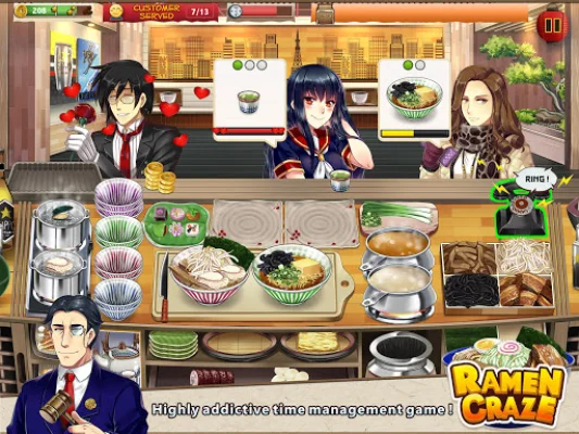 Ramen Craze is a fun and exciting cooking game that allows you to cook and serve delicious ramen dishes anytime and anywhere. With over 100 ramen ingredients to choose from, including Chashu, Naruto, Grilled Eel, BBQ pork, and Mussel, the recipes will continue to grow as you progress through different cities. Roll up your sleeves and complete your customer's ramen orders to make them happy and earn tips for excellent service. You can also cook other Japanese cuisine items like Zabu Soba, Okonomiyaki, and Yakitori in your own Japanese ramen kitchens on your mobile phone.