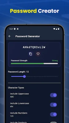 The Advanced Password Generator allows for any length from 4 characters and the ability to mix numbers, uppercase and lowercase letters, and special characters. It also provides real-time security strength analysis and prevents keyboard patterns and consecutive characters. Users can easily copy the generated password with one touch.