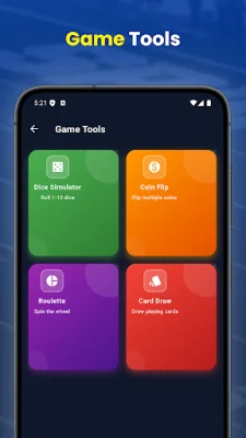 The Fun Game Tools feature includes a Dice Simulator for rolling 1-10 dice simultaneously, a Coin Flip for multiple coins at once, a Custom Roulette for creating your own choice wheel, and a Card Draw for random selection from trump cards.