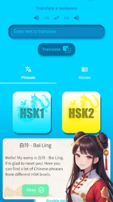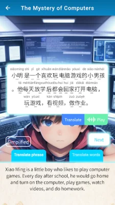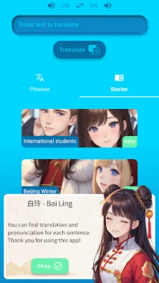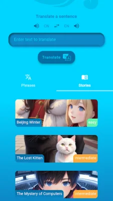 This application allows users to read stories in Mandarin and learn different Chinese phrases. The phrases are organized by HSK level, making it easy for users to track their progress and choose appropriate phrases to learn. Each phrase is also voiced and can be represented in pinyin, a system for representing Chinese characters using the Roman alphabet. This makes it easier for users to learn the correct pronunciation of each phrase.