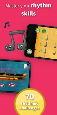 In Rhythmic Village, you will embark on an adventure with the lively and cheerful music notes known as Rhythmiacs. They reside in a village filled with rhythmic challenges, and you will join them on their journey to improve your reading and rhythm skills. This can be done by tapping on a virtual percussion instrument or by using a real instrument with the app's microphone feature. You can even clap along to the beat!