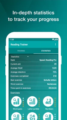 The app focuses on developing key skills such as rapid recognition of numbers, letters, and words, flexible eye movements, improved concentration, and increased vision span. It guides you through individual training steps and tracks your progress with a statistics function. The more you practice, the more stars you earn, bringing you closer to your goal of effective reading skills and high reading speeds.