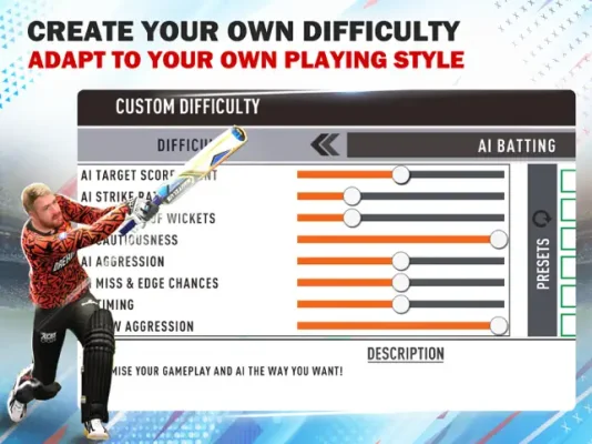 Real Cricket Swipe is not an official product of the International Cricket Council (ICC) or any ICC Member, but it offers a unique and customizable experience for players. The app features a Custom Difficulty mode, where players can shape the AI to match their own play style. With over 20 adjustable gameplay elements, players can fine-tune the AI's batting and bowling strategies, creating a unique cricket experience every time they play.