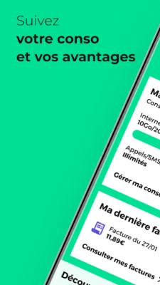 Grâce à la rubrique "Ma conso", vous pouvez consulter et télécharger le détail de vos dernières factures, ainsi que suivre votre consommation en France et à l'étranger. Vous avez également la possibilité de gérer vos achats multimédia et de modifier votre plafond d'achat. Pour les voyages à l'étranger, l'application vous offre un écran d'accueil personnalisé pour suivre votre consommation internet, appels et SMS/MMS.