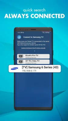 Sam Remote TV is a convenient and easy-to-use virtual remote control that allows you to control your Samsung TV from your iPhone or iPad. To use this app, your phone or tablet must be connected to the same wifi network as your TV. Additionally, you will need to accept a one-time message that appears on your TV screen. The best part? You don't even have to be close to your TV to use this app, as it runs through your wireless network. One of the main features of Samsung Remote is its ability to automatically detect your Samsung TV. This means you won't have to go through the hassle of manually connecting your TV to the app. Once connected, you will have complete control over your TV, including the ability to change channels, adjust the volume, and access other remote control functions. But that's not all - Samsung Remote also offers mouse and keyboard control for your TV. This feature comes in handy when you need to type in a search query or navigate through menus on your TV. And with the option to validate only once on TV Remote, you won't have to constantly re-enter your TV's information every time you use the app. Another convenient feature of Samsung Remote is its ability to automatically connect to previously connected Samsung TVs. This means you won't have to go through the setup process every time you want to use the app. Simply open the app and it will automatically connect to your TV. Thank you for choosing to download this app. We hope it enhances your TV viewing experience. However, if for some reason the app does not work with your phone or TV, please feel free to send us an email at [email protected]. We are constantly working to improve our app and would appreciate any feedback you have.