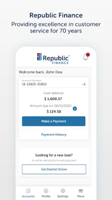 Welcome to Republic Finance, where you can easily manage your account and make payments using your bank account or debit card. Our user-friendly application allows you to view your account information and details, as well as access pre-qualification with no impact to your credit score. You can also find a branch or contact us for any assistance you may need.