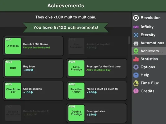 Achievements can be completed to earn bonuses, and players can earn offline time to accelerate their progression. The leaderboard allows players to compare their progress with others and strive to become the best. Detailed statistics and customizable options add to the gaming experience, allowing players to track their progress and tailor the game to their preferences.
