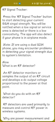 Radio frequency (RF) technology is a form of wireless communication that uses electromagnetic signals to transmit information. These signals fall within a specific range of frequencies, from 3kHz to 300 GHz, and are commonly used in wireless electronics. RF detectors are devices that can detect the presence of these signals, and are often used to identify the presence of bugs or other surveillance devices. Using an RF detector is a simple process, as these devices are designed to pick up on the signals emitted by bugs. When a bug is detected, the detector will typically light up or make a sound to indicate its presence. These detectors are also known as RF power detectors or RF responding detectors, and can be purchased as standalone devices or as modules. The main purpose of an RF detector is to measure and control the power of RF signals in wireless systems. This is important for ensuring that the signals are within safe and legal limits set by regulatory agencies like the Federal Communications Commission. The RF Signal Tracker app allows RF engineers to monitor and log signal quality directly on their Android smartphones. This includes tracking the strength of RF and WiFi signals, identifying changes in technology and handover points, and saving and playing back data. In addition to monitoring signal strength, the RF Signal Tracker app also provides detailed information about the currently used network. This includes the network operator, SIM operator, phone type, network type, network strength in dBm and ASU, data state and activity, country code, and device ID. This information is important for understanding and optimizing the performance of wireless systems. One of the primary applications of RF detectors is measuring the output power of transmitters. This is essential for ensuring that the power levels are within regulatory limits and can be adjusted as needed. The RF Signal Detector app has a simple tool for viewing the current WiFi connection signal strength, which is important for understanding the performance of wireless networks. Overall, the RF Signal Tracker and Detector app is a useful tool for RF engineers and anyone interested in monitoring and optimizing wireless systems. It provides detailed information about signal strength and network performance, and can help identify the presence of bugs or other surveillance devices. With its user-friendly interface and various features, this app is a valuable resource for anyone working with RF technology.