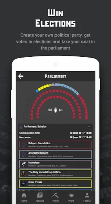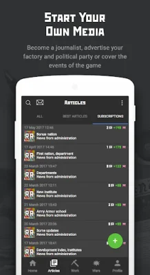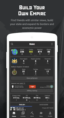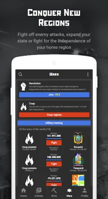 In this application, you will have the opportunity to participate in various types of wars, including air, land, sea, and space battles. Additionally, you can create your own newspapers and publish articles, giving you a platform to express your thoughts and ideas. One unique aspect of this app is the ability to use real world regions to form your own state. You can choose between a dictatorship or a presidential republic as the form of government for your state. The choice is yours!