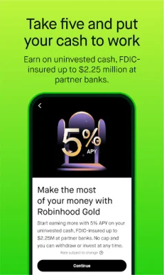 Take your investing to the next level with Robinhood Gold. Earn 5% on your uninvested cash and enjoy bigger instant deposits (up to $50k). Eligible users can also take advantage of margin investing at a competitive rate. And with access to Nasdaq Level II data and Morningstar research, you can stay on top of the market and make strategic moves. Try it out for free for 30 days, then pay just $5 per month for continued access.