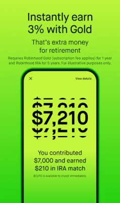 Boost your retirement savings with Robinhood! Our platform offers a variety of features to help you make the most of your investments. With Robinhood Gold, you can earn an extra 3% on every dollar you contribute to your IRA. And the best part? There's no limit on the amount of dollars matched! Simply subscribe to Robinhood Gold (with a small fee) and start earning more for your future. But hurry, this offer is only available until April 30th (terms and conditions apply).