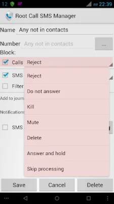 For calls, users can choose between two blocking options: "Reject" or "Not to answer". For SMS messages, users can set a filter in the text to block specific messages from a certain number. Multiple filters can be separated by a semicolon. Users can also create a list of numbers to block and make it current, or choose to not block any numbers at all.