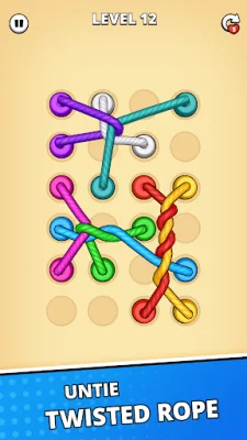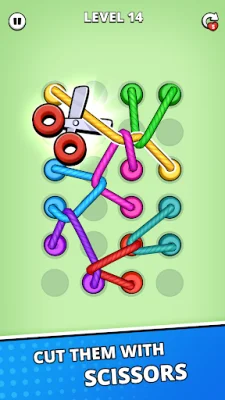 Rope Puzzle is an exciting mobile game that will put your logic and puzzle-solving skills to the test. With a series of challenging levels, you'll have to navigate through increasingly complex challenges by moving pins to untangle ropes from twisted tangles. The key to winning is finding the perfect string pull and using boosters like scissors and time freezes to help you along the way. If you can't untangle the ropes in time, don't worry - you can always restart the level and try again.