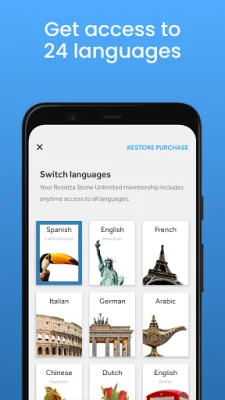 Rosetta Stone's language learning app is designed to help users immerse themselves in a new language, making it the best way to learn. The app uses the Dynamic Immersion® method, which combines interactive and contextual language lessons with Extended Learning features. This allows users to have everything they need at their fingertips, anytime and anywhere, without any ads. The app has received numerous awards, including the 2019 PCMag Editors' Choice, 2019 Tabby Awards Winner, and 2019 Best Mobile App Awards for Best Designed App and Best Overall App. It offers a subscription that includes access to all languages, giving users the freedom to switch between languages and explore their curiosity. With Rosetta Stone, users can practice and learn to speak over 20 languages, including Spanish, French, German, Italian, English, Japanese, Korean, Chinese, Arabic, and more. The app is designed to help users speak confidently, with speaking-focused lessons, instantaneous pronunciation feedback with TruAccent, and a track record of success. The app also allows users to customize their learning experience by selecting their desired language and creating a personalized game plan. This includes curated content and helpful lesson reminders to keep users on track in their language learning journey. The app is flexible and fits any schedule, with 10-minute lessons that can be taken anywhere, online or offline. It also offers a variety of features to enhance the learning experience, such as Audio Companion® lessons, Phrasebook for easy-to-understand greetings and phrases, and the ability to touch and hold words for translations. Rosetta Stone's Dynamic Immersion® method helps users learn in context, making it more effective than traditional memorization methods. The app also offers Extended Language Learning features, such as reading aloud with native speakers, to improve pronunciation and practice speaking like a local. The app is available for a subscription, with options for 3, 12, or lifetime access. It offers a wide range of languages, including Spanish, French, German, Italian, English, Japanese, Korean, Chinese, and more. Enterprise and Education learners also have access to the app, with varying features available. Overall, Rosetta Stone's language learning app is a comprehensive and effective tool for anyone looking to learn a new language.