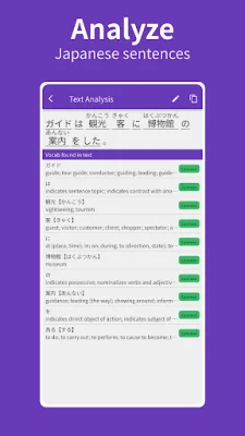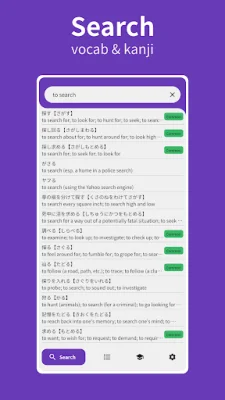 The application is a comprehensive tool for learning and studying Japanese language and characters. It offers various features such as search, vocab, kanji, flashcards, and lists, all designed to help users improve their understanding and proficiency in the language. The search function allows users to search for characters using romaji, kana, and kanji, and even offers handwriting recognition for convenience. This makes it easier for users to find any character they need and analyze Japanese text to understand its words and meanings.