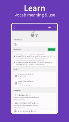 The vocab feature provides users with definitions, alternative forms, frequency, and other basic information about words. It also offers tens of thousands of example sentences and conjugation forms, making it a valuable resource for expanding vocabulary and understanding word usage. Additionally, it includes pitch accent information, which is crucial for proper pronunciation in Japanese.