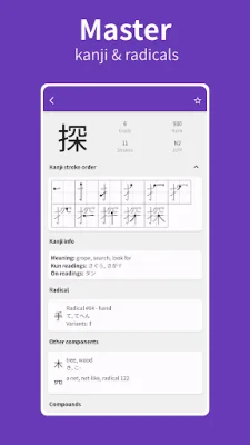 The kanji feature is a useful tool for learning and understanding the complex characters in Japanese. It provides the meaning, reading, stroke count, and other basic information about each kanji, along with a stroke order diagram and a breakdown of its radical and components. It also offers a list of vocabulary words that use the kanji, making it easier for users to learn and remember them.