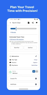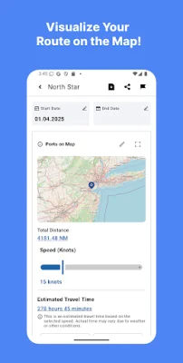 The trip planning and navigation feature allows users to input their start and end ports, and the app calculates the total distance in nautical miles. It also provides an estimated travel time based on the vessel's speed. The map view with clearly marked ports helps users visualize their route and plan effectively. A disclaimer reminds users to consider potential weather or other conditions that may affect their travel time.
