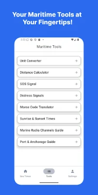In addition to navigation, Sea Navigator offers a robust set of tools tailored for mariners. These include a unit converter, distance calculator, SOS and distress signals, Morse code translator, sunrise and sunset times, marine radio channels guide, and port and anchorage guide. These tools are essential for communication, planning, and safety at sea.