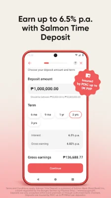 The Salmon app also offers savings and time deposit options through Salmon Bank (Rural Bank) Inc., a BSP-licensed bank. These products provide a simple, safe, and regulated way to build savings over time. Whether users are saving for short-term goals or planning for the future, these deposit options offer reliable and accessible banking at their fingertips.