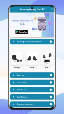 The application provides a comprehensive overview of the Samsung Galaxy Buds FE, including its pros and cons, specifications, price and release date, sound quality, design, and features. This information can be useful for those considering purchasing the Samsung Galaxy Buds FE or for current owners who want to learn more about their device.