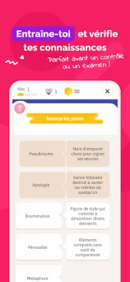 Pour chaque cours, l'application offre des vidéos animées de 5 minutes, des fiches de cours et de révision, ainsi que des quiz et exercices pour se préparer aux contrôles. Les fiches sont concises et comprennent des tableaux synthétiques, des récapitulatifs et des encarts pour mettre en avant les points importants. Des exercices interactifs sont également disponibles pour rendre les révisions plus ludiques et aider les élèves en difficulté.