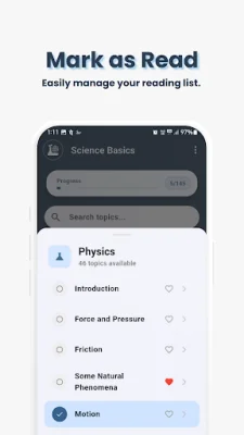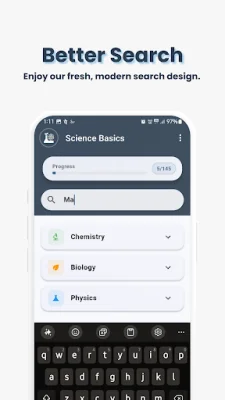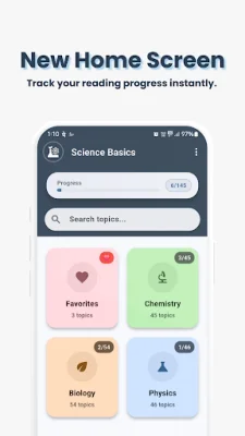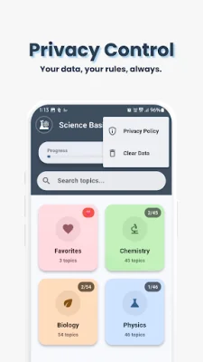 The app covers a wide range of topics in Physics, Chemistry, and Biology, including force and pressure, atomic structure, and cell function. It also includes information on notable scientists, inventions, and Nobel Prize winners in each field. This makes it a valuable resource for students looking to reinforce their fundamentals, quickly review before exams, or for curious learners revisiting core scientific concepts.