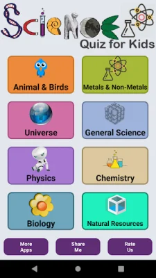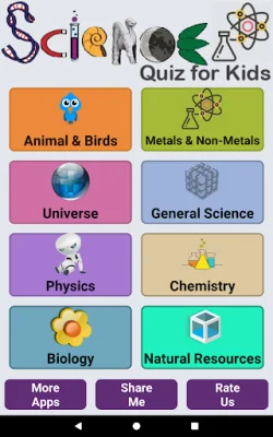 This application is a comprehensive resource for learning about a wide range of scientific topics. It is divided into several sections, each of which covers a different area of science. These sections include Animal and Birds, Metal and non metals, universe, Natural Resources, Physics, Chemistry, Biology, and general science. Each section contains information, images, and interactive elements to help users understand and engage with the material.