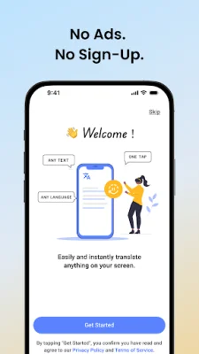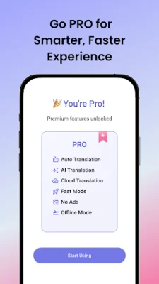 The app's main feature is its effortless screen translation. Users simply need to tap "Start" on the home screen and a discreet floating bubble will appear. From there, they can open any app and tap the bubble to translate the entire screen instantly. This allows for full-screen translation in just one tap.