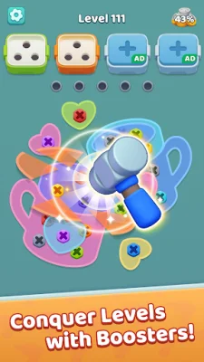 The application is a puzzle game where the player must tap screws of the same color to put them into a box. The goal is to avoid running out of spare holes. The player must plan their moves carefully to handle overlapping color boards. The game also features powerful tools to help overcome challenging levels. The overall tone of the game is fun and lighthearted.