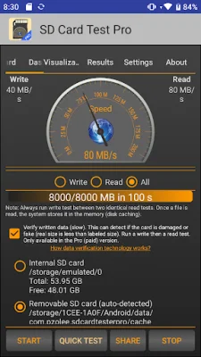 To use the app, users first select the type of storage they want to test, either internal or external. If the app is unable to detect any SD card, users can still manually browse it if one is present in the device. Next, users can choose between a write or read test, with the recommendation to always run a write test first. The app displays the speed on a speedometer in the Dashboard tab and provides more detailed information on the Visualization and Results tabs.