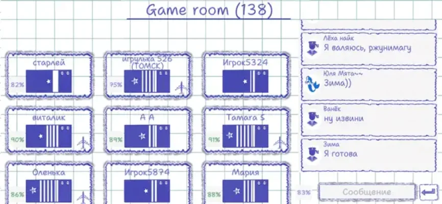 If you want to play against a real opponent online, simply go to the game room and select your opponent by clicking on their card. The percentages displayed next to their name indicate the number of games they have completed. So, choose your opponent wisely and get ready for an exciting game of Sea Battle.