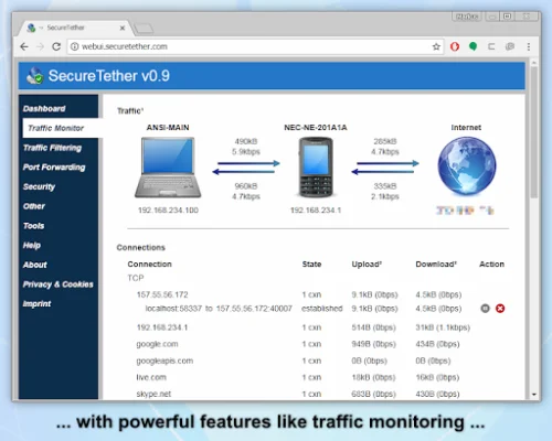 SecureTether is an application that allows you to share your mobile internet connection with your computer or Android tablet. Unlike other apps that only provide HTTP proxy, SecureTether gives you a full internet connection. This means that you can access any website or online service, not just limited ones. You can use this feature anywhere you have cell service, and it works with any data connection on your phone, such as 4G, 3G, LTE, GPRS, WiFi, WiMax, and more. The best part is that you don't need to pay for a tethering plan from your mobile carrier or root your phone or tablet. In addition to providing a full internet connection, SecureTether also offers powerful security and tethering management features. It has a built-in firewall to protect your computer from hackers and can monitor all incoming and outgoing internet connections to detect spyware. You can also block specific websites, which is useful for limiting data usage on a limited plan or preventing automatic updates on Windows. Using SecureTether is easy, with setup instructions and screenshots available for Windows, Mac OS X, and Android. You can also manage and monitor your connections directly from your browser on your computer or tablet. The premium version of the app delivers maximum performance, utilizing the full capabilities of your WiFi, cell service, and CPU. It also includes a DNS cache to speed up website loading and reduce data usage. SecureTether is compatible with a wide range of devices, including any Android 4.0.1+ device, Windows Vista, 7, 8, 8.1, and 10, Mac OS X 10.5+, and Linux (experimental). It also supports port forwarding, making it compatible with streaming, gaming, VoIP, and other software. However, it does not directly support devices like Xbox, PlayStation, or Roku, which do not support VPNs or HTTP or SOCKS proxies. But, you can still connect these devices by sharing your computer's internet connection using Internet Connection Sharing. It is important to note that SecureTether uses your phone plan's regular data volume, not the tethering volume. This means that you can use it without a tethering plan in most cases, but some providers may detect and block tethering traffic. Regular data rates apply, and the free version of SecureTether has a speed limit of 1Mbps after an initial three-week unlimited-speed trial. However, you can remove this limit by purchasing the premium version. To use SecureTether, your Android device must have version 4.1.1 or newer, as older versions do not allow simultaneous operation of WiFi and WiFi Direct. And while computers need to be configured, it can be done using tools that come with Windows, Mac OS, or Linux. In some rare cases, you may need to use the OS installation media or have an internet connection. The Android client app is small and can be downloaded from the SecureTether hotspot, so you don't need an internet connection to install it.