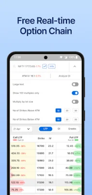 For those looking for in-depth analysis, the app provides various tools such as NSE option chain, open interest analysis, FII DII analysis, option price calculators, intraday F&O charts, implied volatility (IV) charts, and futures data. It also offers options data such as option Greeks, put call ratio (PCR), and IndiaVix to help users make informed decisions.
