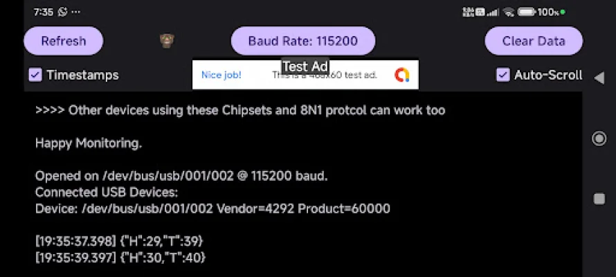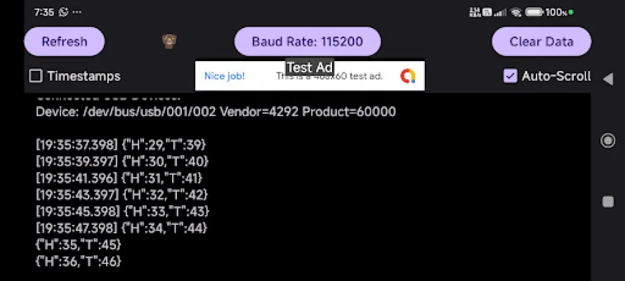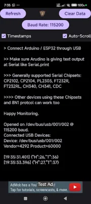 Overall, this application is a useful tool for those working with Arduino or ESP32 devices. It allows for easy power supply through a phone's USB port and offers various speeds for data transfer. The auto-scroll and time stamp functions make it user-friendly and the potential addition of an input feature for Arduino devices in the future shows the developer's commitment to improving the application based on user feedback.
