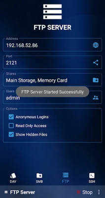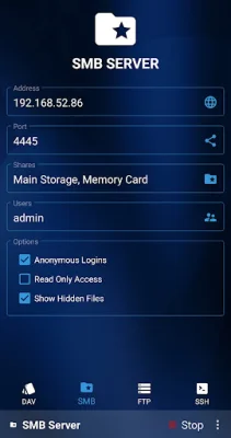 This application is a customizable server that allows users to adjust various settings to their liking. It supports both SD cards and attached USB devices, making it convenient for users to access their files. The server also has the option for multiple users, including an anonymous option for added privacy. Users can also create multiple shares, or mount points, for easy organization of their files.