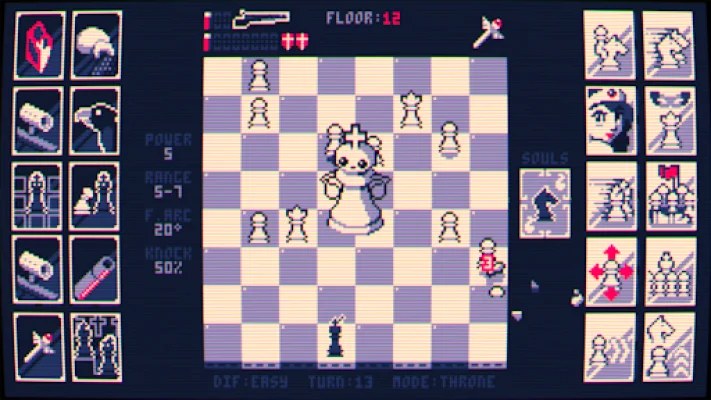 In this game, you have the option to either move your king or shoot at enemy pieces on each turn. However, after shooting, you will need to move again in order to reload your shotgun. The main objective is to avoid being put in checkmate while also trying to eliminate the enemy king to complete the floor. Each floor presents a new challenge and the ultimate goal is to regain control of your kingdom.