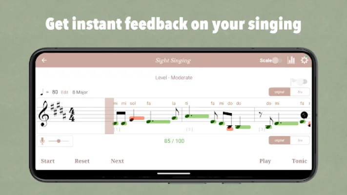 Using Sight Singing Pro is simple and user-friendly. Users can check the tonic of a music score, scroll through the score for an overview, and then press "Start" to sing along with the score. The app provides visual feedback with green and red bars to indicate pitch accuracy, and users can also listen to the song in the correct pitch with the "Play" button.