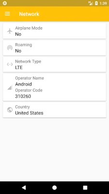 In addition to SIM card information, the app also displays network information such as airplane mode status, roaming status, network type (CDMA/LTE/HSPA/GPRS), network operator ID and name, and network country. This allows users to have a better understanding of their network connection and troubleshoot any issues that may arise.