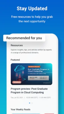 As a student with Simplilearn, you'll also enjoy a variety of perks. Our platform offers incredible growth opportunities through standard video content, top-notch mentorship from industry specialists, and 24x7 support. You'll also have access to over 100 e-books and 500+ articles, as well as immensely educational Skillup Bytes and job vacancy alerts.