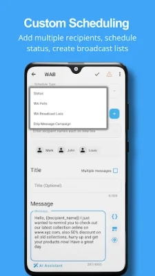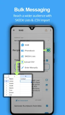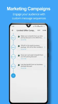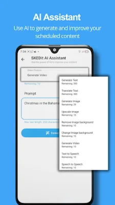 SKEDit offers a variety of features to make communication easier and more efficient. Users can automate messages on WhatsApp, Telegram, and Messenger, use the AI assistant for text generation and enhancement, schedule WhatsApp status updates, and send unlimited messages to unlimited recipients with unlimited attachments. The app also allows for customized auto-replies, repeat scheduling, and drip message campaigns.