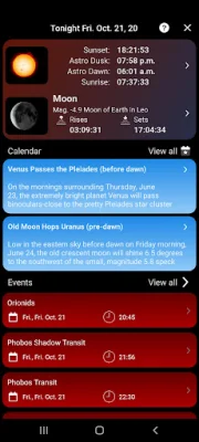 SkySafari is a mobile application that allows users to easily locate and identify planets, constellations, satellites, and millions of stars and deep sky objects simply by holding their device up to the sky. With interactive information and rich graphics, it serves as the perfect stargazing companion for anyone looking to explore the wonders of the night sky. The latest version, Version 7, offers complete support for the latest version of Android and regular updates to ensure users have the best experience possible. One notable feature is OneSky, which allows users to see what other users are observing in real time. This feature highlights objects in the sky chart and indicates how many users are observing a particular object. Another new feature is Sky Tonight, which provides information on what is visible in the sky on a given night. This includes Moon and Sun information, curated calendars, and the best positioned deep sky and solar system objects. The Orbit Mode allows users to virtually travel to planets, moons, and stars, while the Guided Audio Tours provide over four hours of audio narration to teach users about the history, mythology, and science of the heavens. The Galaxy View feature allows users to visualize the 3-D location of stars and deep sky objects in our galaxy, the Milky Way. And for those who struggle with pronouncing celestial object names, SkySafari offers a pronunciation guide to help users learn the correct way to say them. For those new to SkySafari, the app offers a variety of features to enhance the stargazing experience. Users can hold their device up to the sky and the star chart will automatically update with their real-time movements. They can also simulate the night sky from any location on Earth in the past or future, and track the locations of the Sun, Moon, and Mars. In addition to these features, SkySafari offers a wealth of information on the history, mythology, and science of the heavens. Users can browse through hundreds of object descriptions, astronomical photographs, and NASA spacecraft images. They can also stay up-to-date with the Sky Calendar, which provides information on all major sky events. For those looking for even more features, the SkySafari Premium Subscription offers access to a massive deep sky database, events, curated news and articles, connected stargazing features, a light pollution map, and more. And for the ultimate experience, users can upgrade to SkySafari 7 Plus or SkySafari 7 Pro, which offer even more features and telescope control. With its user-friendly interface and vast array of features, SkySafari is the perfect app for anyone interested in exploring the wonders of the night sky.