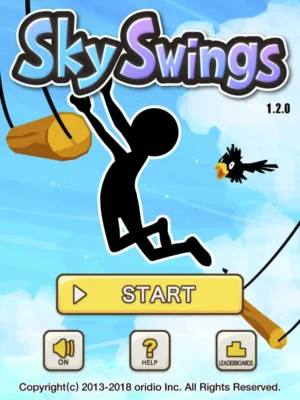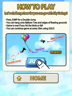 This application is a fun and exciting game that challenges players to see how far they can go while swinging through the air. The objective of the game is to jump forward by pressing the JUMP button and try to avoid hitting birds or falling. Players can also perform a double-jump while in mid-air and can hang onto a Balloon Tree or the edges of floating grounds to help them progress further in the game. However, if they do hit a bird or fall, the game is over. Players also have the option to continue the game at every 50 meters using Gold, which can be earned throughout the game.