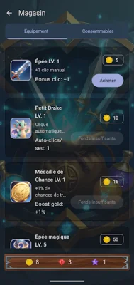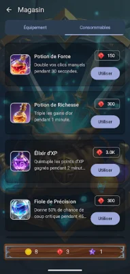 Vous pourrez également débloquer des compétences dévastatrices telles que "Coup Critique", "Multi-Clic" et "Apocalypse Clic" pour anéantir vos ennemis plus rapidement que jamais. Et pour des combos encore plus puissants, vous pourrez activer des potions de force, des élixirs de chance ou des pluies de talents.
